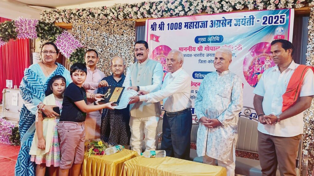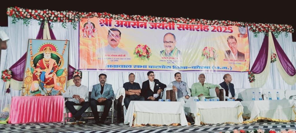 कोरबा। अग्रवाल सभा कटघोरा व बालकोनगर द्वारा बड़े हर्षोल्लास और धूमधाम के साथ श्री श्री 1008 महाराजा अग्रसेन जयंती समारोह का आयोजन किया गया। इस अवसर पर भारतीय जनता पार्टी जिला कोरबा के ऊर्जावान जिलाध्यक्ष गोपाल मोदी मुख्य अतिथि के रूप में शामिल हुए, जहां अग्रवाल समाज के लोगों द्वारा श्री मोदी का आत्मीय रूप से स्वागत किया गया। इस समारोह मे गोपाल मोदी ने महाराजा अग्रसेन जी की प्रतिमा पर माल्याअर्पण और पूजन पश्चात कार्यक्रम का शुभारंभ किया गया। अग्रवाल सभा कटघोरा द्वारा मुख्य अतिथि गोपाल मोदी और विशिष्ट अतिथि योगेश जैन का शाल श्रीफल भेंटकर सम्मानित किया गया। आयोजित किए गए विभिन्न प्रतियोगिता में प्रतिभागीयो को पुरस्कार का वितरण किया गया।समारोह में उपस्थित अतिथियों ने महाराजा अग्रसेन जी के आदर्शों, सिद्धांतों और त्याग-बलिदान की परंपरा पर प्रकाश डाला। समाज में एकता, सहयोग और सेवा भाव को जीवन का मूलमंत्र बताते हुए सभी ने अग्रसेन जी को युगपुरुष करार दिया।