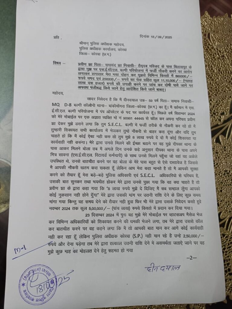 दीनदयाल उम्र 59 वर्ष पिता समारु निवासी-MQ D-8 बल्गी कॉलोनी थाना बांकीमोंगरा जिला कोरबा (छ.ग.) का हूँ। मैं वर्तमान में एस. ई.सी.एल. बल्गी परियोजना में पंप ऑपरेटर के पद पर कार्यरत हैं। पिछले वर्ष सितम्बर 2024 को मेरे मोबाईल पर एक अज्ञात व्यक्ति मों नं 90981 44445 से कॉल कर अपना परिचय प्रवीण झा देकर मुझे डराने लगा कि तुम S.E.C.L. बल्गी में फर्जी तरीके से नौकरी कर रहे हो में तुम्हारी शिकायत सभी कार्यालय में भेजकर तुम्हे नौकरी से बाहर करा दूंगा और यदि तुम चाहते हो कि मैं कोई ऐसा नही करु तो तुम मुझे 8 लाख रुपये दे दो मैं कोई शिकायत या कार्यवाही नहीं करूंगा। मेरे द्वारा उनसे मिलने की ईच्छा बताने पर वह मुझे दीपका थाना के पास आकर मिलने बोला तब मैं अगले दिन उनके कहे अनुसार दीपका थाना के पास अपने मित्र सावना (एस.ई.सी.एल. रिटायर्ड कर्मचारी) के साथ उनसे मिलने पहुँचा जो वहां वह अकेले उपस्थित थे, उनसे बातचीत करने पर वह बोला के मेरे पास बहुत से ऐसे दस्तावेज है जिससे मैं आपकी नौकरी खतम करा सकता हूँ लेकिन आप मेरा कहा मानते है तो मैं आपकी सुरक्षा करने को तैयार हूँ मेरा बड़े-बड़े पुलिस अधिकारी एवं S.E.C.L. अधिकारियो से परिचय है. उसकी बात सुनकर तथा भयभीत होकर मेरे द्वारा उनसे पुछा गया कि वह क्या चाहते है तो प्रवीण झा के द्वारा कहा गया कि 8 लाख रुपये मुझे दे दिजिए मैं सब सम्हाल लूँगा आपको कोई नुकसान नहीं होने दूँगा मेरे द्वारा उसकी मांग पर उतनी राशि देने के लिए कुछ समय मांगा गया किन्तु वह समय देने को तैयार नही हुवा फिर भी मेरे द्वारा उसके निवेदन करते हुवे नवम्बर 2024 तक कुल 5,00,000/- (पांच लाख) रुपये किश्तो में प्रदान कर दिया गया।