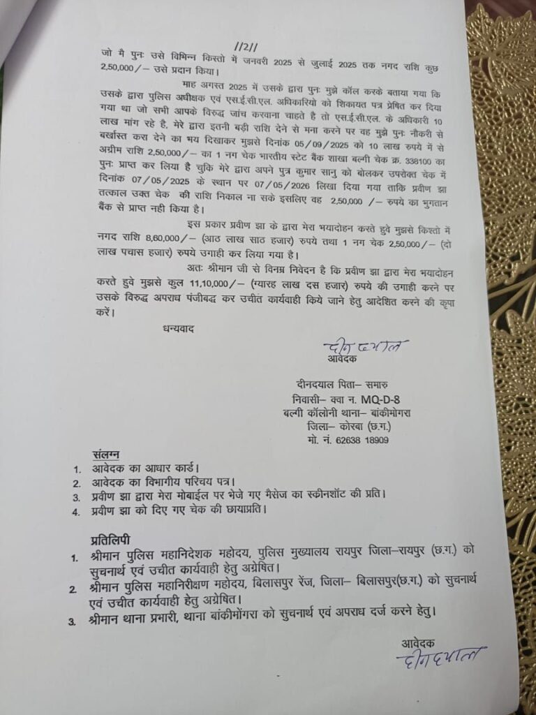 प्रवीण झा पिता रामानंद झा निवासी तैय्यब मस्जिद के पास बिलासपुर के द्वारा मुझ पर एस.ई.सी.एल. बल्गी परियोजना में फर्जी नौकरी करने का आरोप लगाकर लगातार मेरा भया दोहन कर मुझसे विभिन्न किस्तो में 860000/-रुपये नगद एवं 250000/- रुपये का चेक सहित कुल 11,10,000/- (ग्यारह लाख दस हजार) रुपये की उगाही करने पर जांच की शिकायत किए