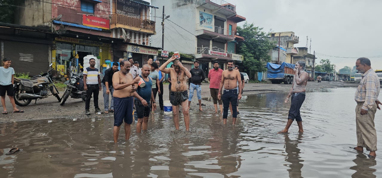 व्यापारियों ने किया स्नान रोड पर भरे गड्डों के पानी से SECL और PWD की उदासीनता