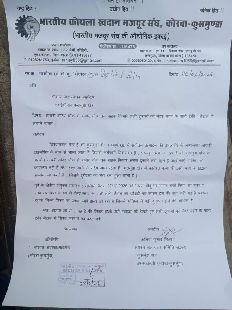 आपको बता दें गायत्री मंदिर चौक में सड़क किनारे लगाए जाने वाले दुकानों से लगातार जाम लगता है,जिससे कर्मचारियों को खदान अथवा ऑफिस जाने में असुविधा होती है। नेहरू नगर पानी टंकी के इस मैदान में दुकानें लगने से आसपास के सभी कॉलोनीवासी यहां आ सकते है और यहां पार्किंग भी की जा सकती है। चौपाटी की तरह इस मैदान का उपयोग किया जा सकता है। परंतु कुसमुंडा प्रबंधन अपने कर्मचारियों के हित को ध्यान में रखने के बजाय एक करोड़पति ठेकदार को फायदा पहुंचाने का काम कर रही है,इस ठेकदार के पास यहां कई एकड़ का मैदान पर कब्जा है, मैदान अंदर 10 – 10 लाख की लागत से बने कई वातानुकूलित भवन भी कब्जा में लिए गए है,जो कि SECL के पैसे से बनाए गए है। इसी ठेकदार के द्वारा कई अधिकारी स्तर के क्वार्टर भी कब्जा किए गए है। इन सभी चीजों की लिखित शिकायत प्रबंधन से की गई है बावजूद इसके प्रबंधन द्वारा अपने कर्मचारियों के हितों को ताक में रखकर यहां सीधे ठेकदार को संरक्षण देते हुए फायदा पहुंचाने का कार्य किया जा रहा है।