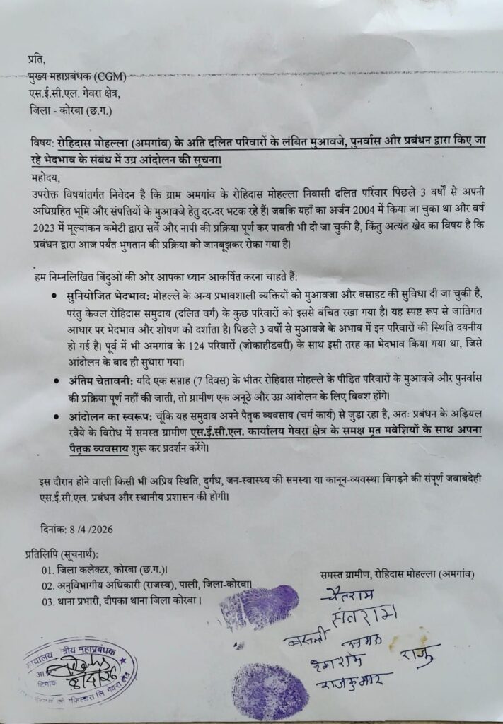 एस.ई.सी.एल. (SECL) गेवरा क्षेत्र के अंतर्गत आने वाले ग्राम अमगांव के रोहिदास मोहल्ला के दलित परिवारों ने प्रबंधन पर गंभीर भेदभाव और हठधर्मिता का आरोप लगाते हुए उग्र आंदोलन का बिगुल फूंक दिया है पिछले 3 वर्षों से लंबित मुआवजे और पुनर्वास की मांग को लेकर ग्रामीणों ने आज मुख्य महाप्रबंधक (CGM) को ज्ञापन सौंपकर सात दिनों का अल्टीमेटम दिया है ।